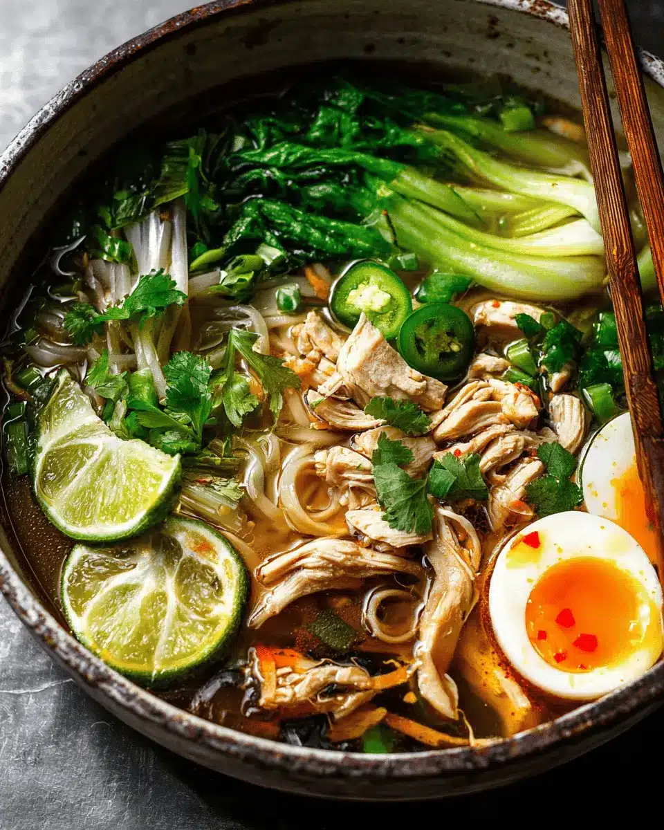 Taste your Asian Chicken Noodle Soup and adjust the seasoning with fish sauce and a squeeze of lime juice for that perfect tanginess. Now’s the time to get creative with garnishes—consider adding fresh cilantro or slices of jalapeño for a kick!
