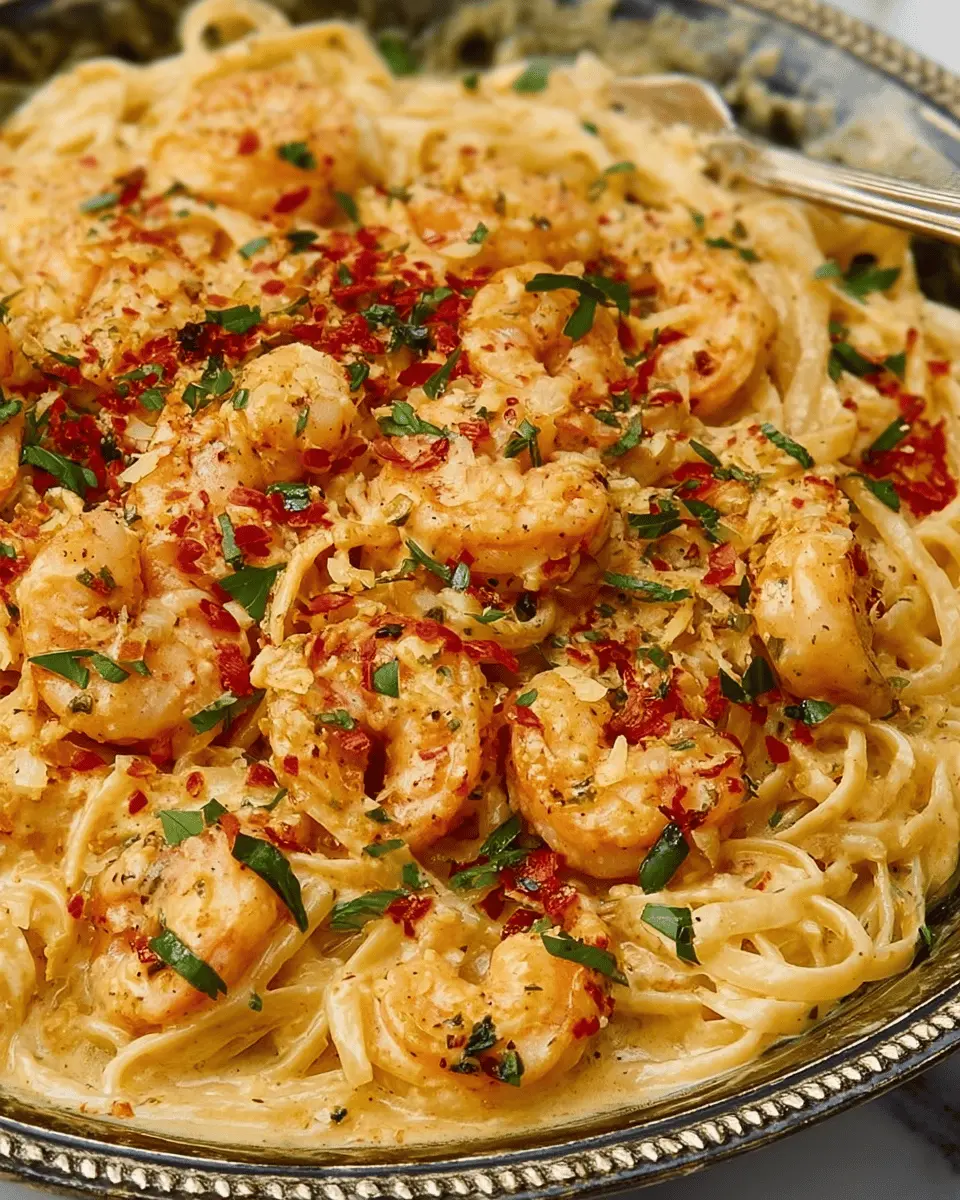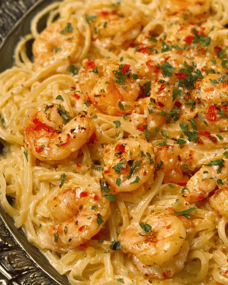 - In a large serving bowl, combine the pasta, shrimp, and sauce mixture and toss.
