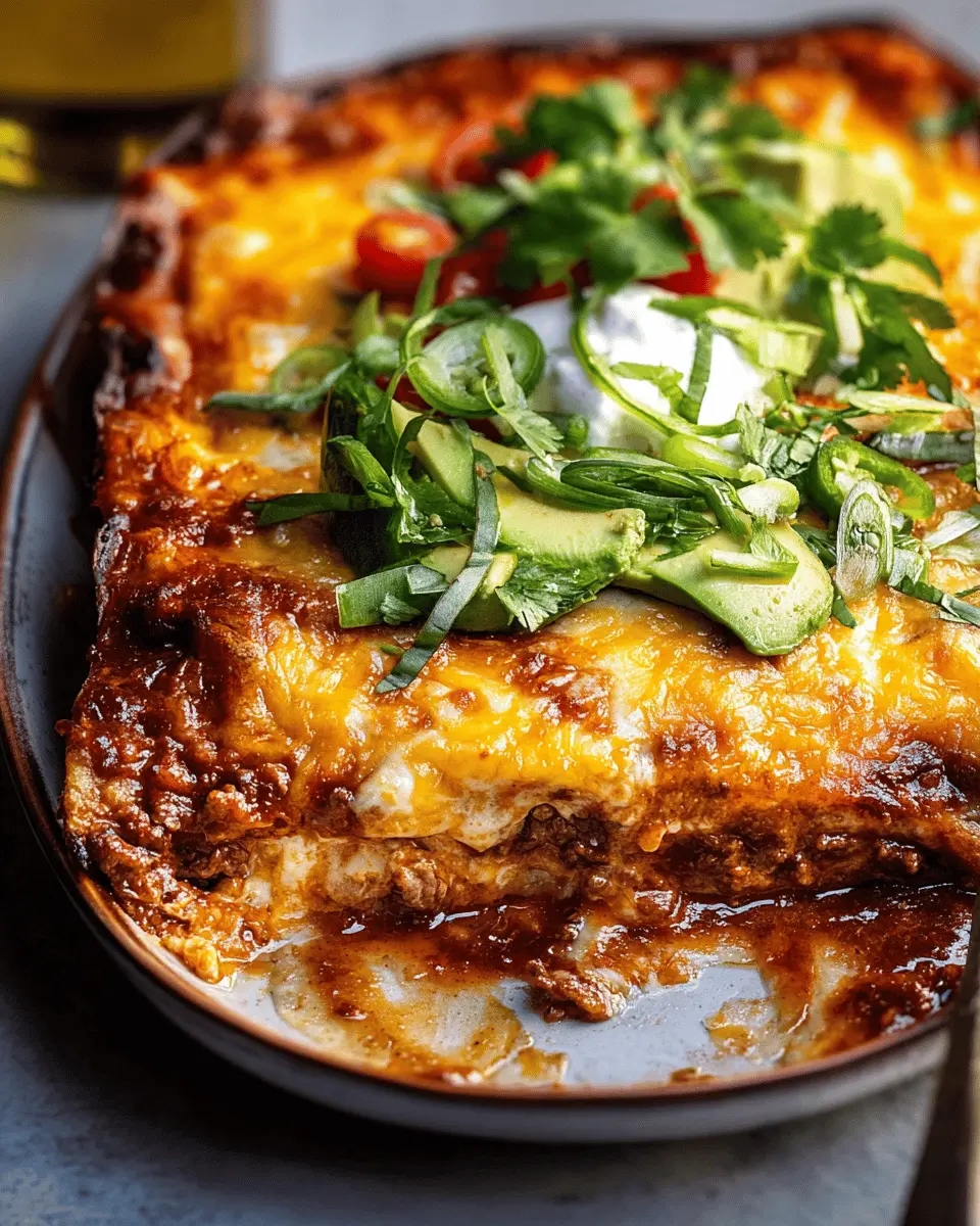 Enjoy this beef enchilada casserole as a comforting meal that will bring smiles to the dinner table! Experiment with toppings like Greek yogurt, fresh lettuce, or avocado for the perfect finishing touch. Dive into this hearty dish and savor every bite!