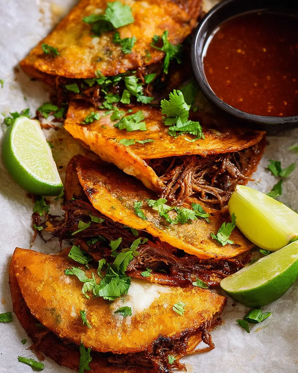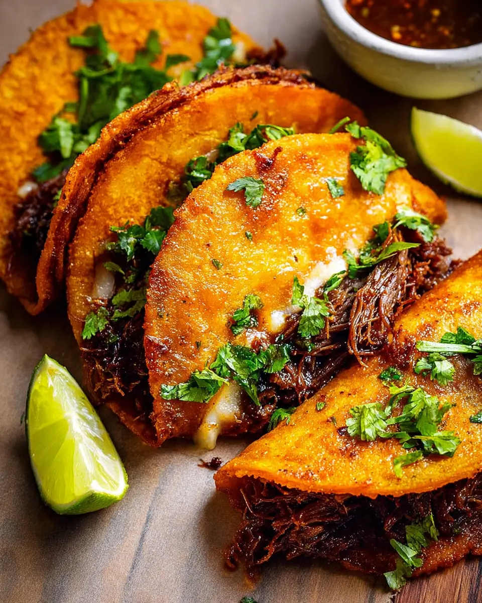 Presentation can elevate your birria taco feast. Serve the tacos on a colorful platter, garnished with a sprinkle of fresh cilantro and lime wedges for a pop of color. Arrange your dips in small, vibrant bowls around the tacos, inviting guests to customize their plates. This setup not only looks stunning but also encourages fun and sharing at the table!