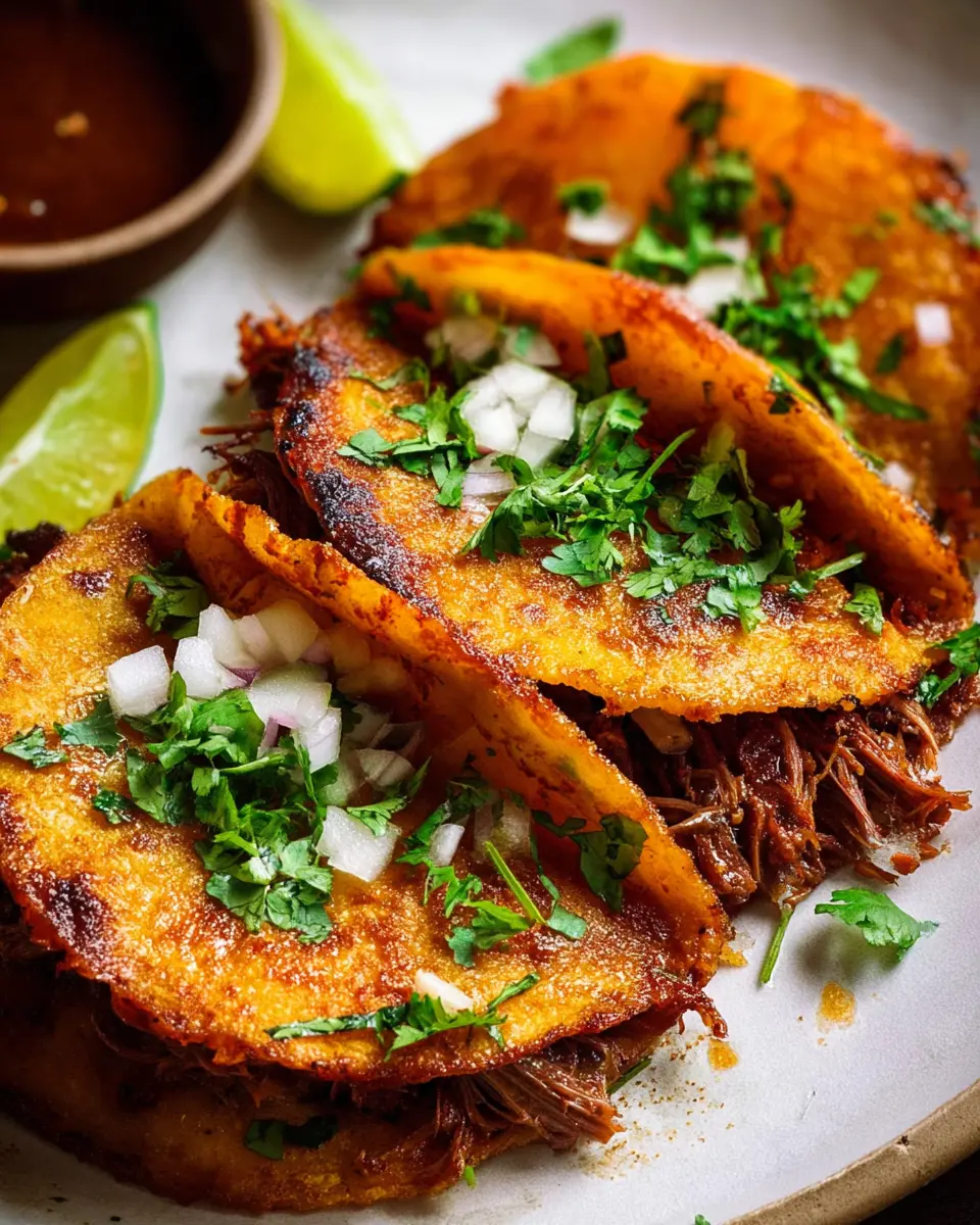 Serve your birria tacos with a side of warm consommé for dipping. Don’t forget to garnish with diced white onion and fresh coriander for a burst of flavor. Lime wedges and your favorite salsa also make great additions to elevate your dining experience.