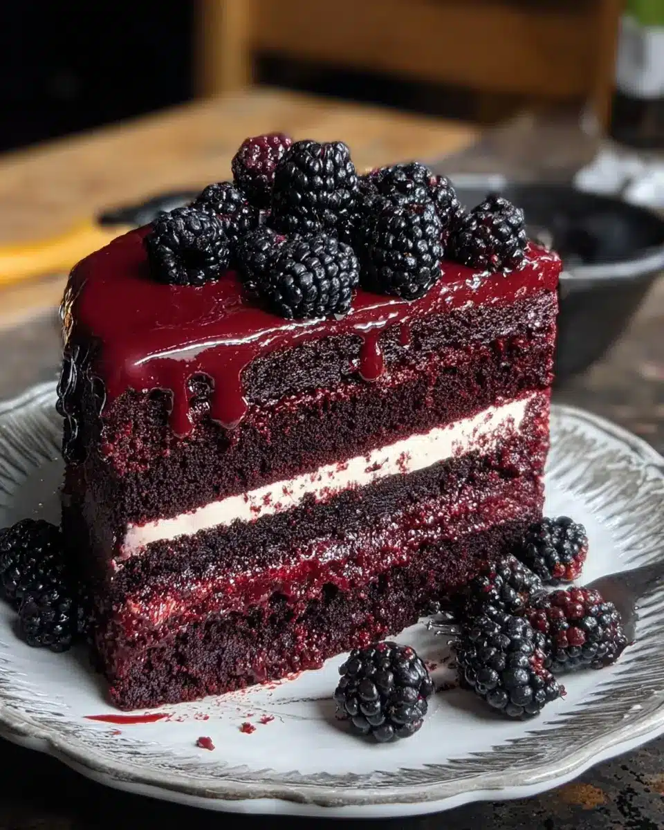 Elevate your Blackberry Velvet Gothic Cake experience by serving it with a scoop of vanilla bean ice cream or a dollop of freshly whipped cream. For a delightful beverage pairing, consider a rich chai latte or a refreshing herbal tea, both of which will complement the cake’s deep chocolatey flavors and tart blackberry notes wonderfully. If you're entertaining, serve it alongside assorted cheeses for a sophisticated touch—think goat cheese or a creamy Brie.