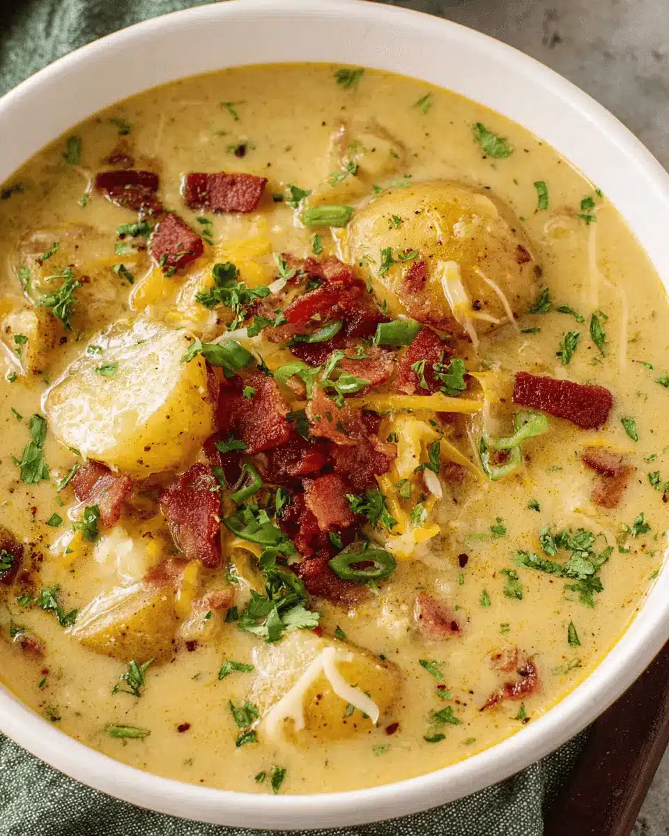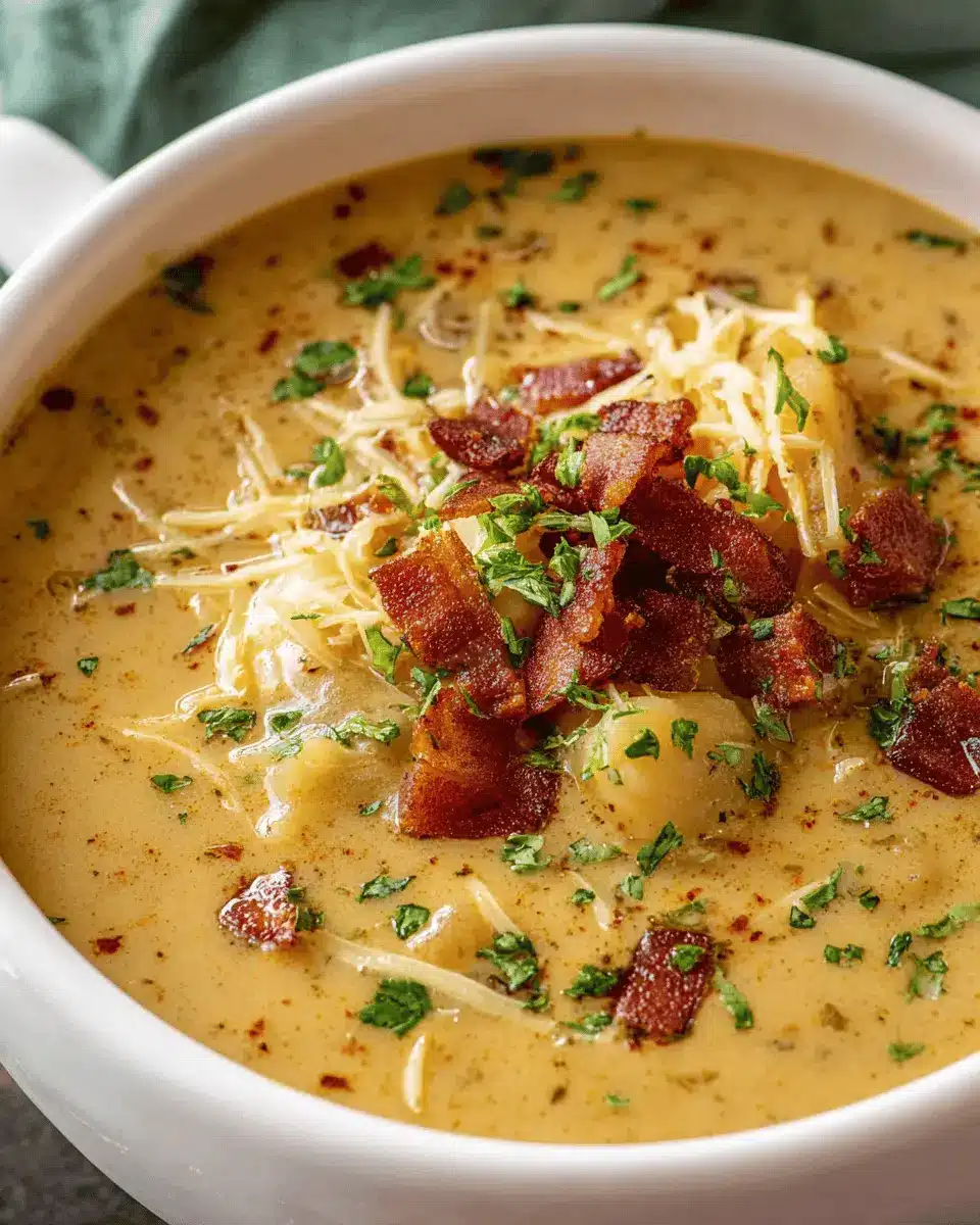 - Ladle the hot soup into bowls. Garnish with chopped green onions, shredded cheddar cheese, crumbled bacon, and fresh parsley if desired.