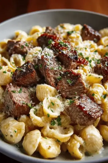 Steak Bites and Shell Pasta in Garlic Butter Alfredo Sauce