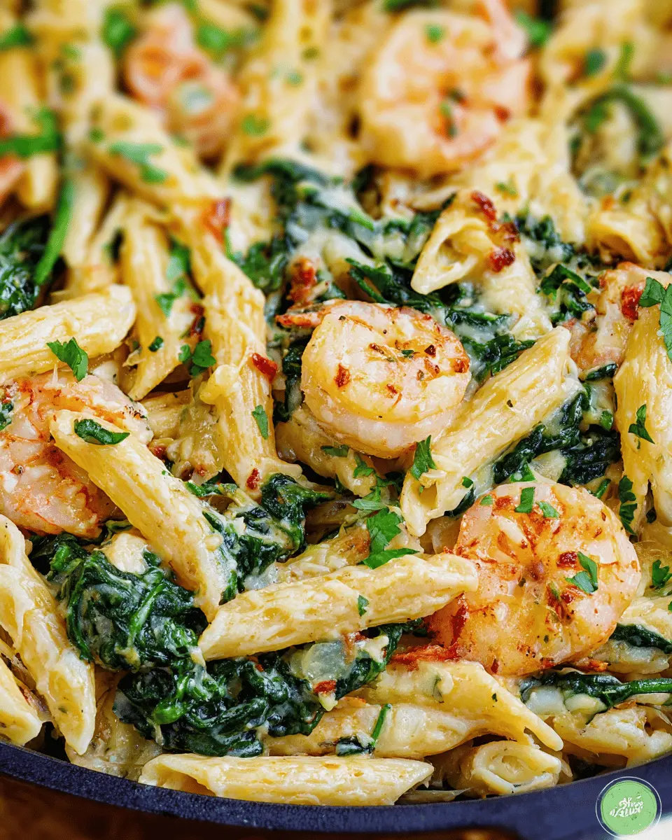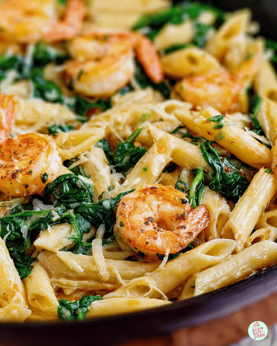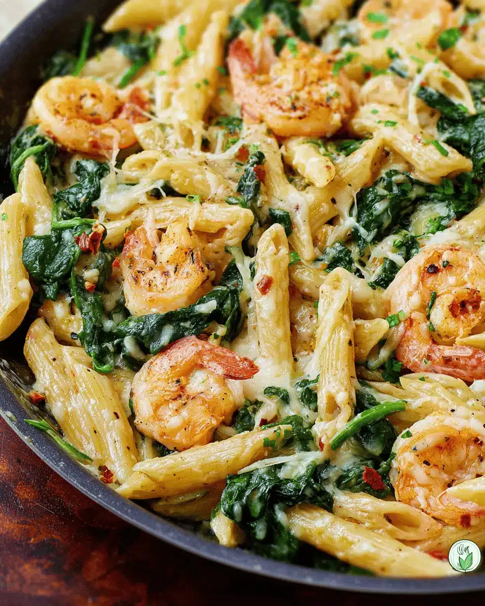With your shrimp perfectly sautéed and spinach softened, it’s time to bring everything together. Add the drained penne pasta directly into the shrimp and spinach mix. Toss everything gently to combine, ensuring that every piece of pasta gets coated in those gorgeous flavors.