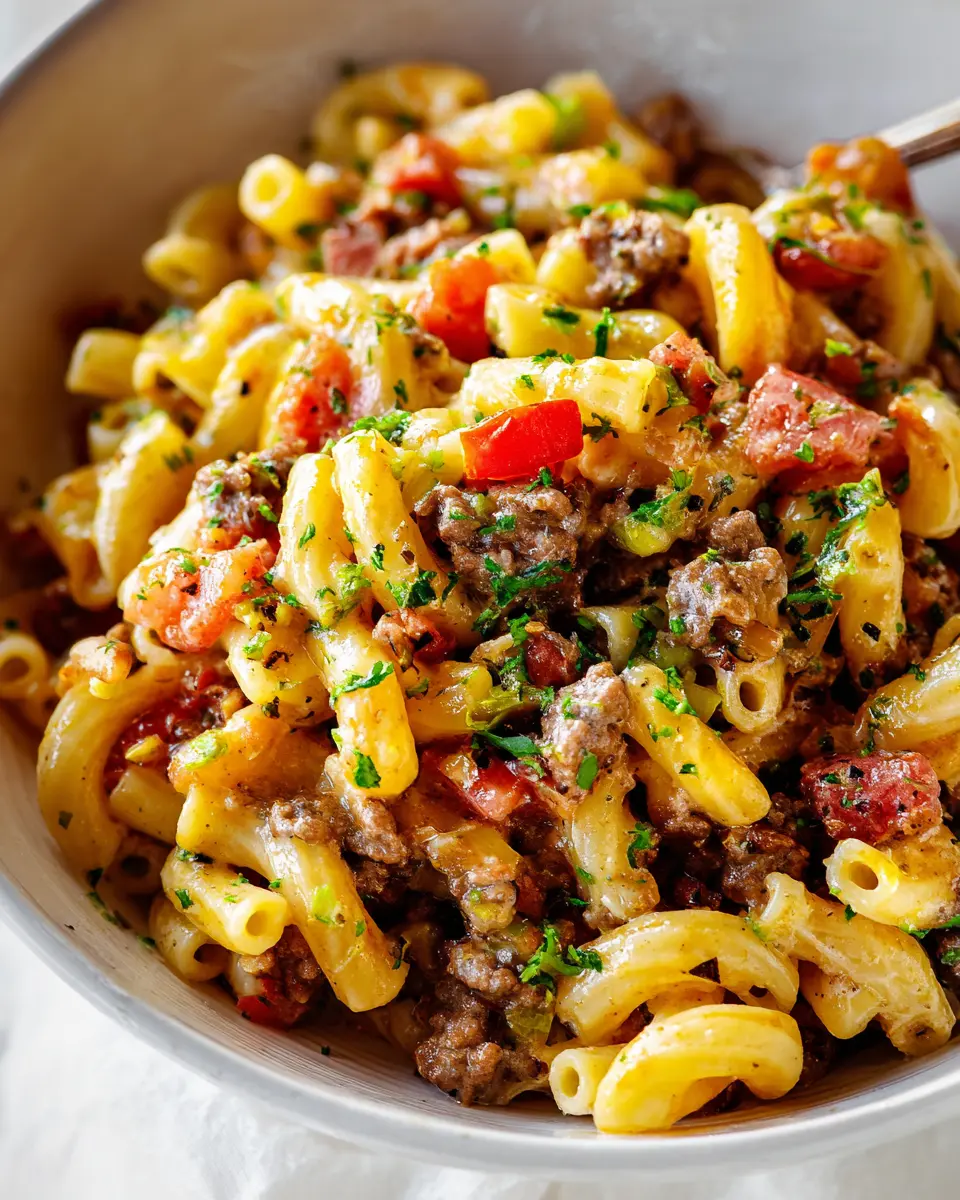 Serving your cheeseburger pasta can be dynamic and fun! Try presenting it in baked individual ramekins topped with extra cheese and baked until golden for a cozy, personal touch. Alternatively, consider stuffing it in a tortilla wrap for a portable lunch option that is sure to impress. Garnish with fresh herbs like parsley or basil for that bright finish. You can also set up a cheeseburger pasta bar at parties—let guests add their choice of toppings like jalapeños, extra pickles, or even a drizzle of barbecue sauce.