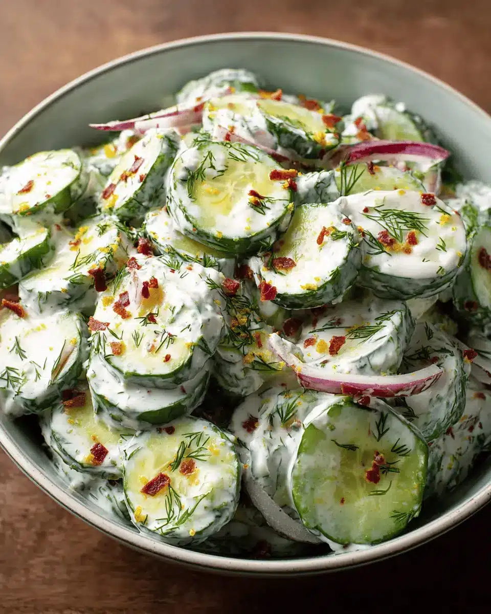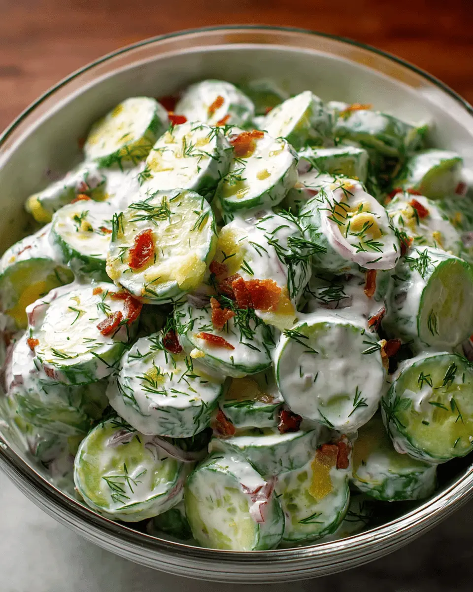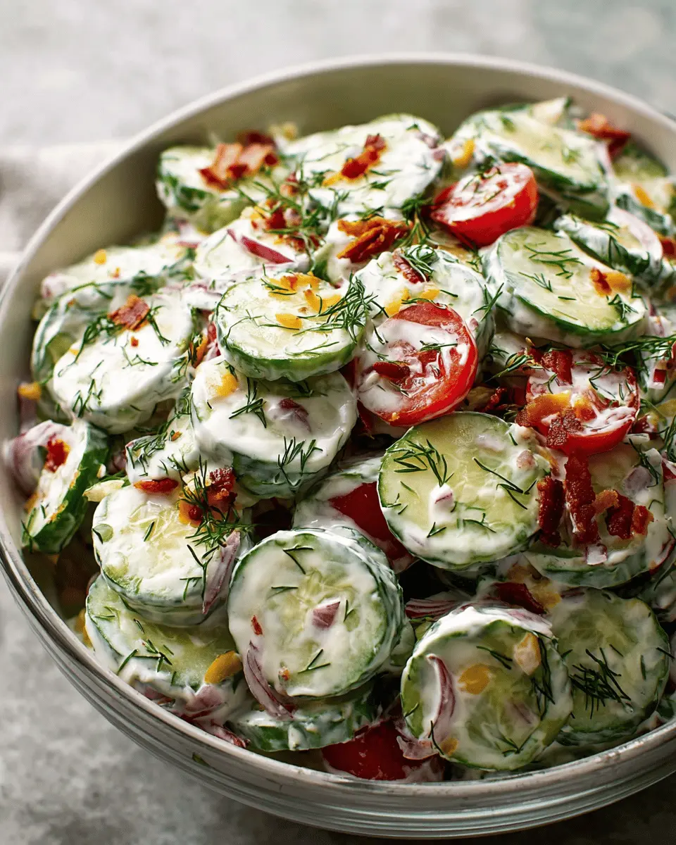 - In a large bowl, combine sliced cucumbers, shredded cheddar, crumbled bacon, red onion, and dill.