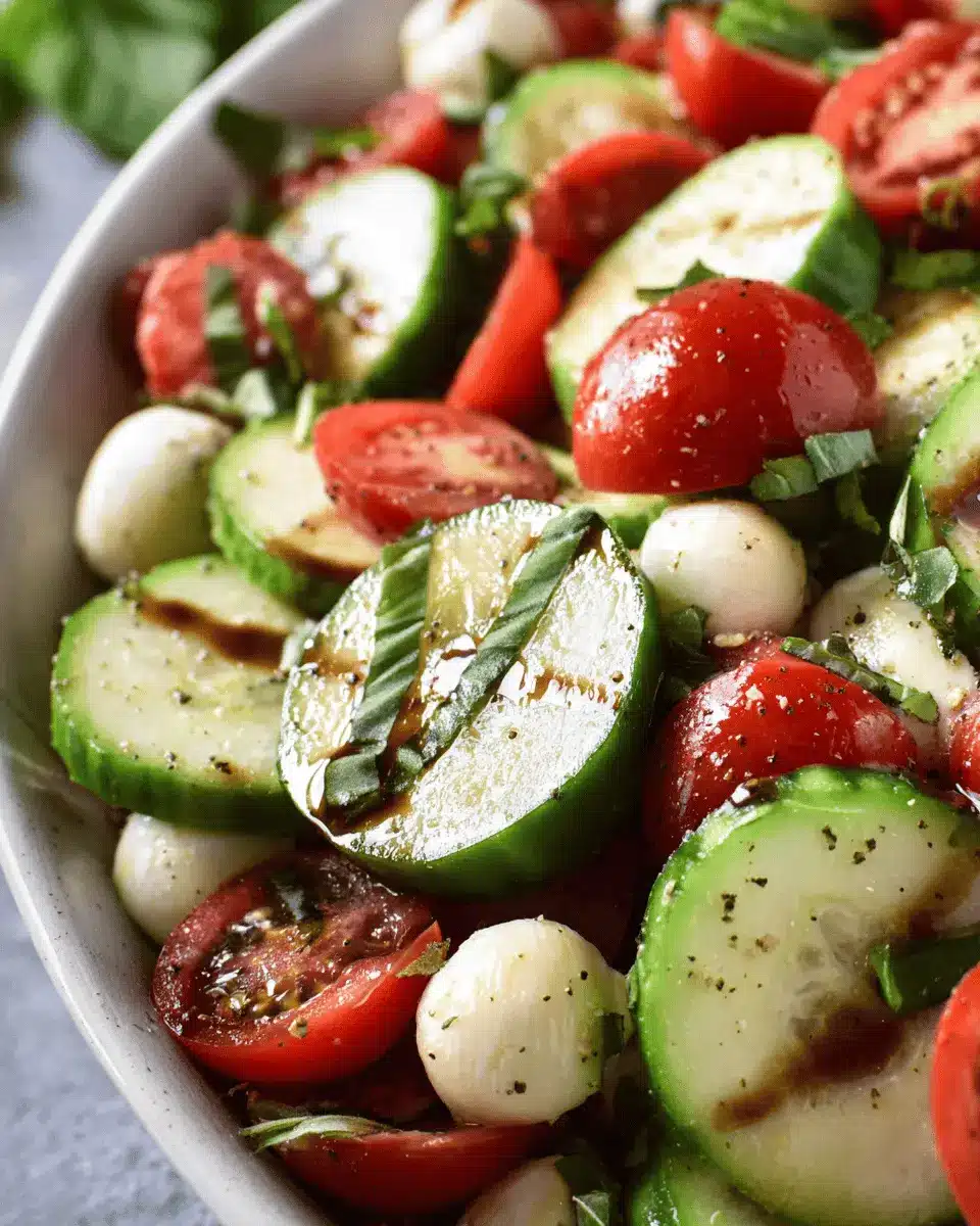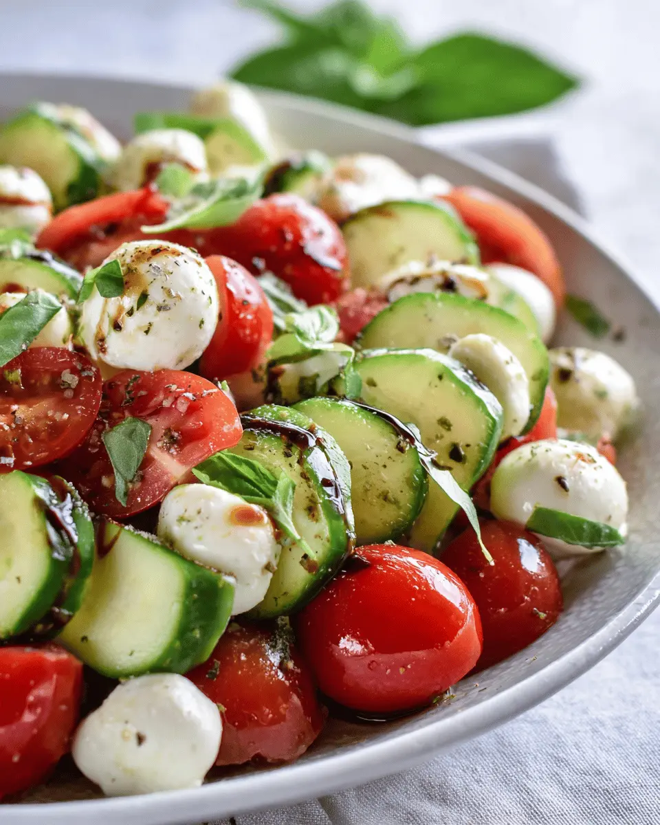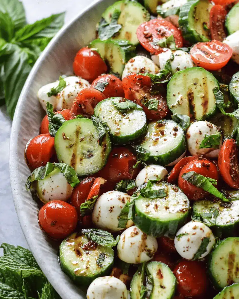 In conclusion, the Cucumber Caprese Salad is not just a salad; it’s a refreshing addition to your summer dining table. With its vibrant colors and hearty ingredients, it’s perfect for gatherings or a simple weeknight meal. Try experimenting with variations to make it your own!