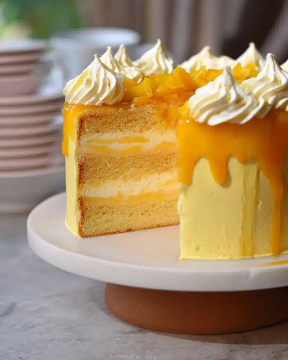 Once the cake layers are cool, it’s time to assemble! Spread a layer of mango buttercream on top of the first layer, then spoon a generous amount of mango compote over it, and then place the second layer on top. Finish off by covering the entire cake with the remaining buttercream. Whether you choose to decorate it with fresh mango slices or leave it simple, every slice of this easy mango cake is sure to impress.