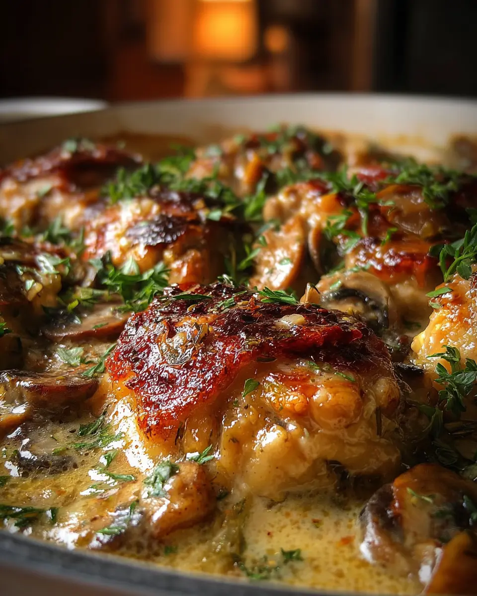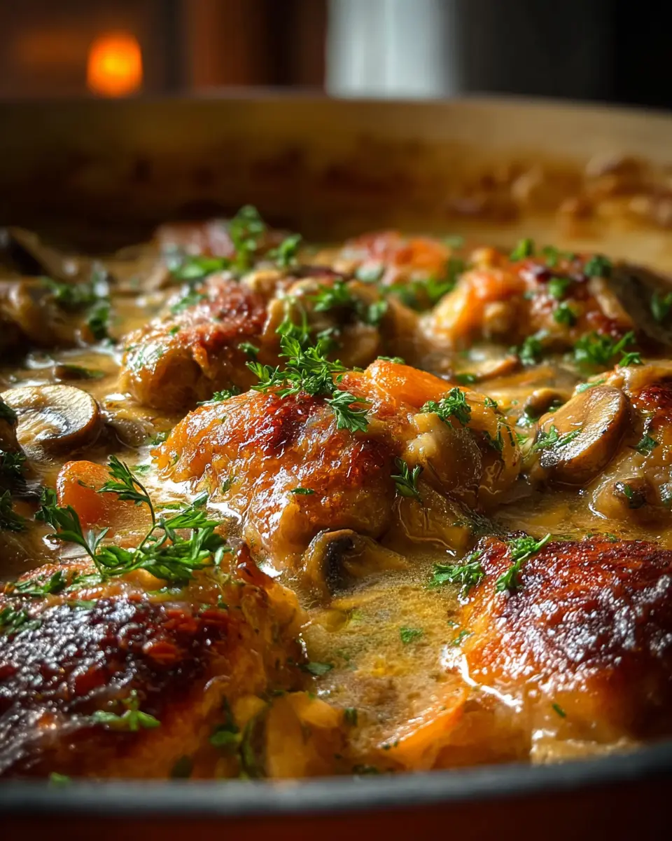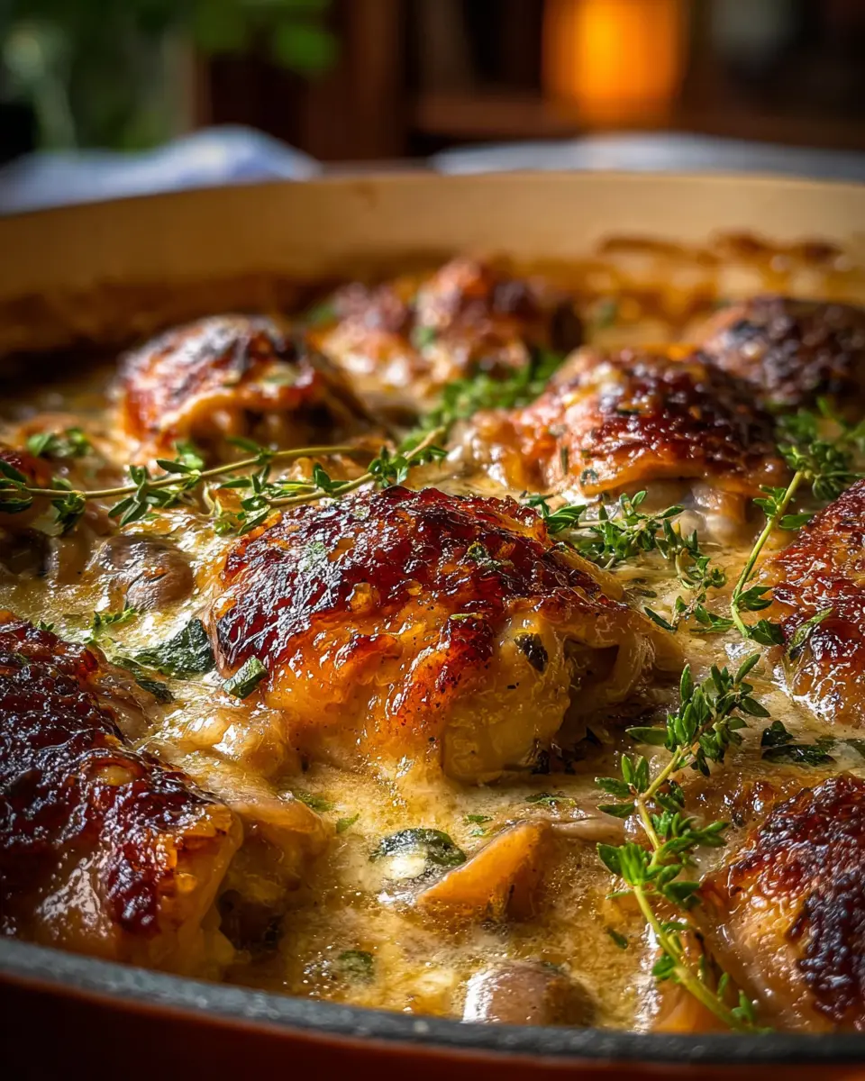 Finally, return the chicken thighs to the pot, skin-side up, ensuring they are nestled in the sauce (it should come halfway up the sides of the chicken). Transfer the casserole to your preheated oven and bake uncovered for 35-40 minutes until the chicken is golden and cooked through. To ensure it’s safe to eat, check for a temperature of 165°F (74°C). When it’s ready, let it rest for 5 minutes, dot it with the remaining butter, and garnished with fresh parsley for a pop of color.