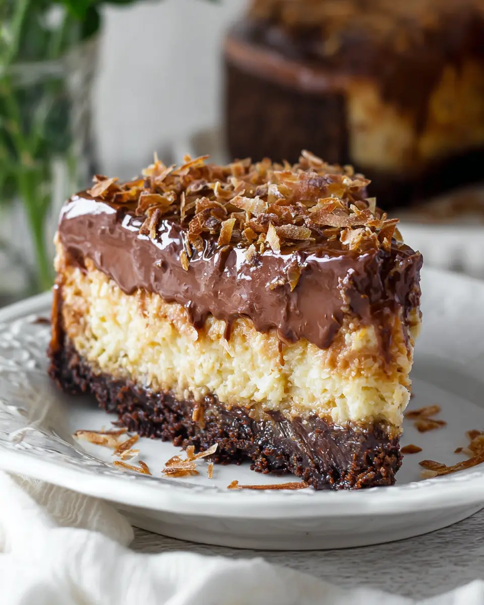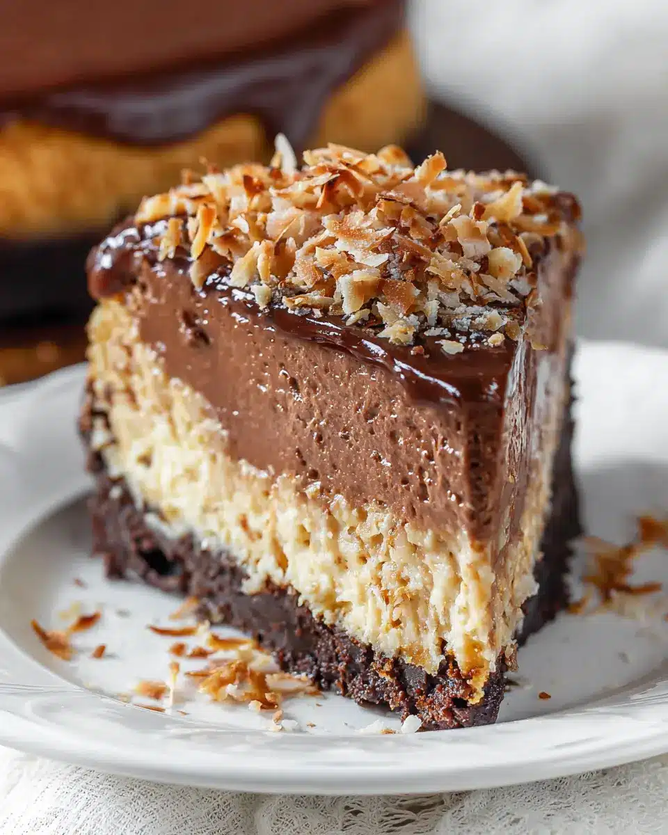 Why should you try making it at home? Well, not only is this dessert a showstopper for gatherings, but it also boasts flavors that resonate with both nostalgia and indulgence. The layers of rich chocolate ganache, the gooey coconut-pecan topping, and that delightful Oreo crust come together to create a symphony of flavors and textures. Plus, it’s a great way to impress friends—who doesn’t love a decadent, homemade cheesecake?