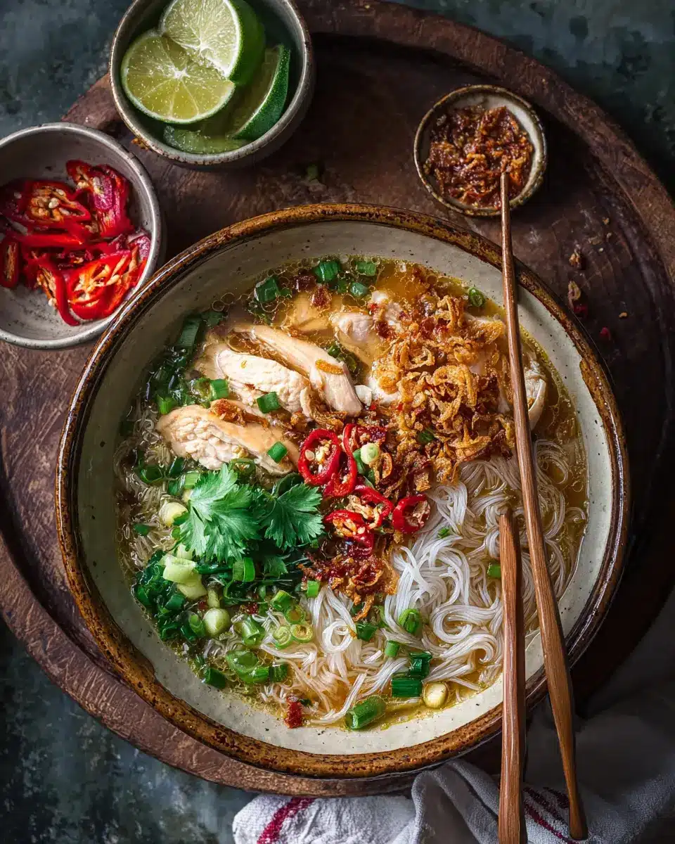 Gingery Chicken and Rice Noodle Soup with Crispy Garlic