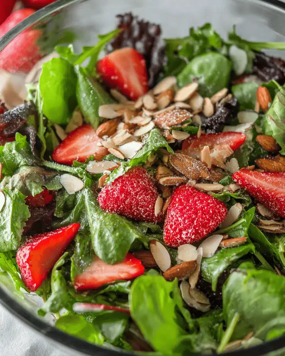 In conclusion, this green salad with strawberries is a vibrant addition to any meal, combining refreshing flavors and textures. Perfect for summer gatherings or a light lunch, it’s both nutritious and delicious. Enjoy the balance of sweet strawberries and crunchy sugared almonds for a delightful experience!