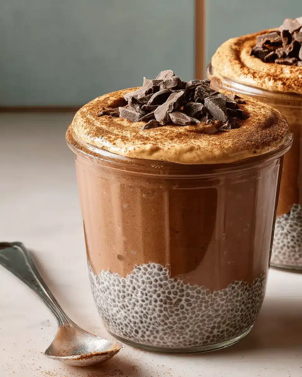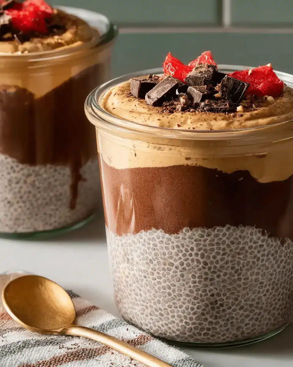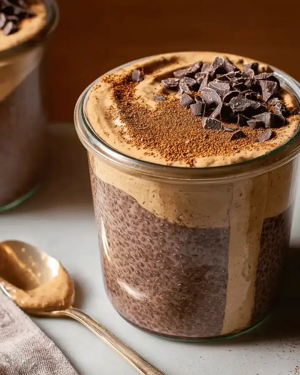 Finally, it’s assembly time! Pull that chilled chia pudding from the fridge and give it a good stir. Divide the pudding evenly among four jars or small bowls—about one cup each. Next, generously spoon the peanut butter mixture over the chia pudding, about a quarter cup for each jar. Feel free to dust with extra cocoa powder for that professional touch!
