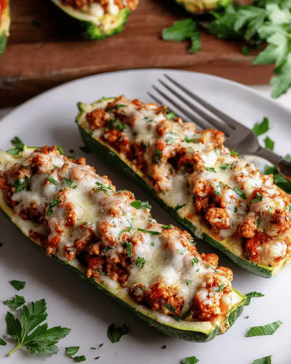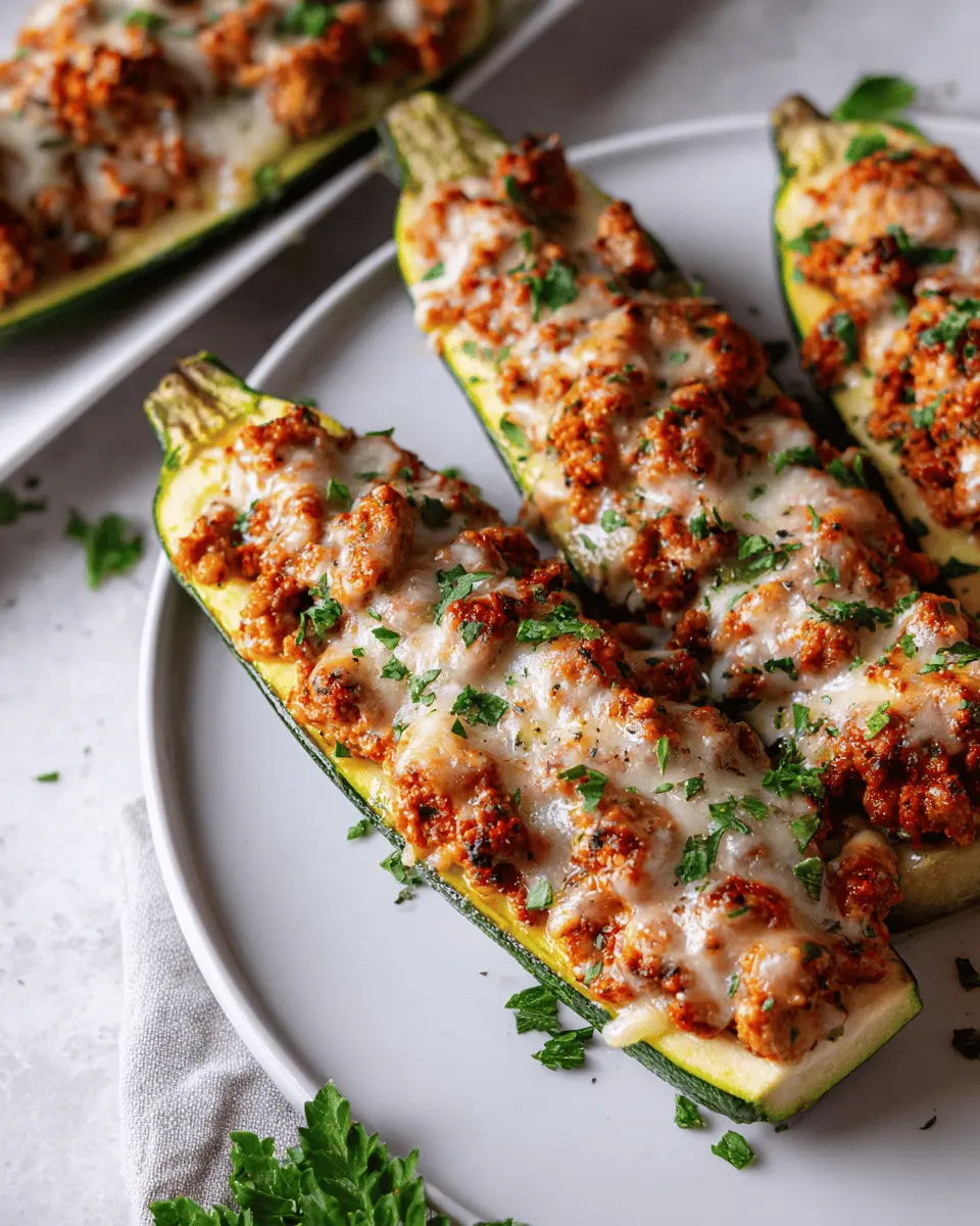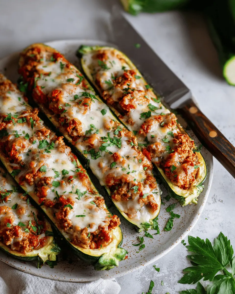 Once your stuffed zucchini boats are out of the oven, let them cool for a minute or two. Serve them warm, perhaps garnished with a sprinkle of fresh basil or parsley for that lovely pop of color. These stuffed delights are not just a feast for the eyes but also a low-carb, family-friendly dinner option that will surely impress!