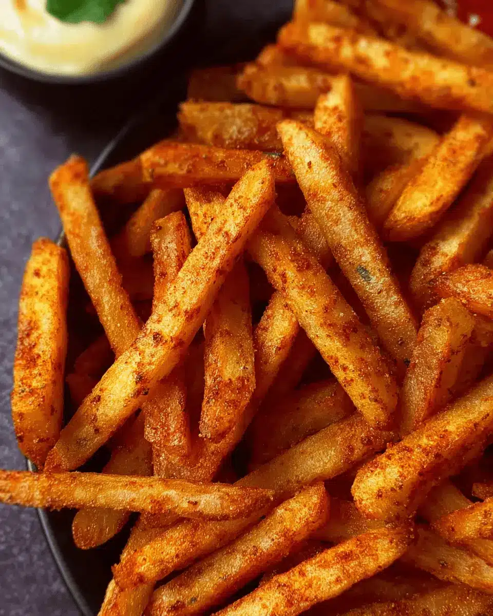 Once done, place the fries on paper towels to absorb excess oil. Serve them hot, perhaps with a tangy dipping sauce, and enjoy every spicy, crispy bite!