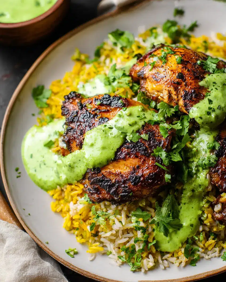 For an impressive presentation, serve the chicken and rice on a large platter, allowing the vibrant colors to shine. Drizzle the creamy green sauce generously over the chicken and sprinkle with fresh cilantro for a pop of green. Consider using colorful plates or bowls to emphasize the dish's eye-catching hues. To elevate the dining experience, use rustic wooden boards or slate platters as a backdrop, making your meal a feast for the eyes as well as the palate!