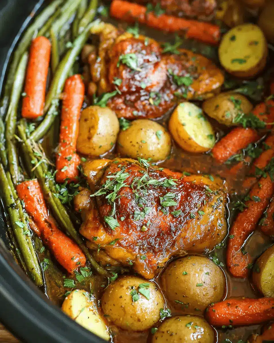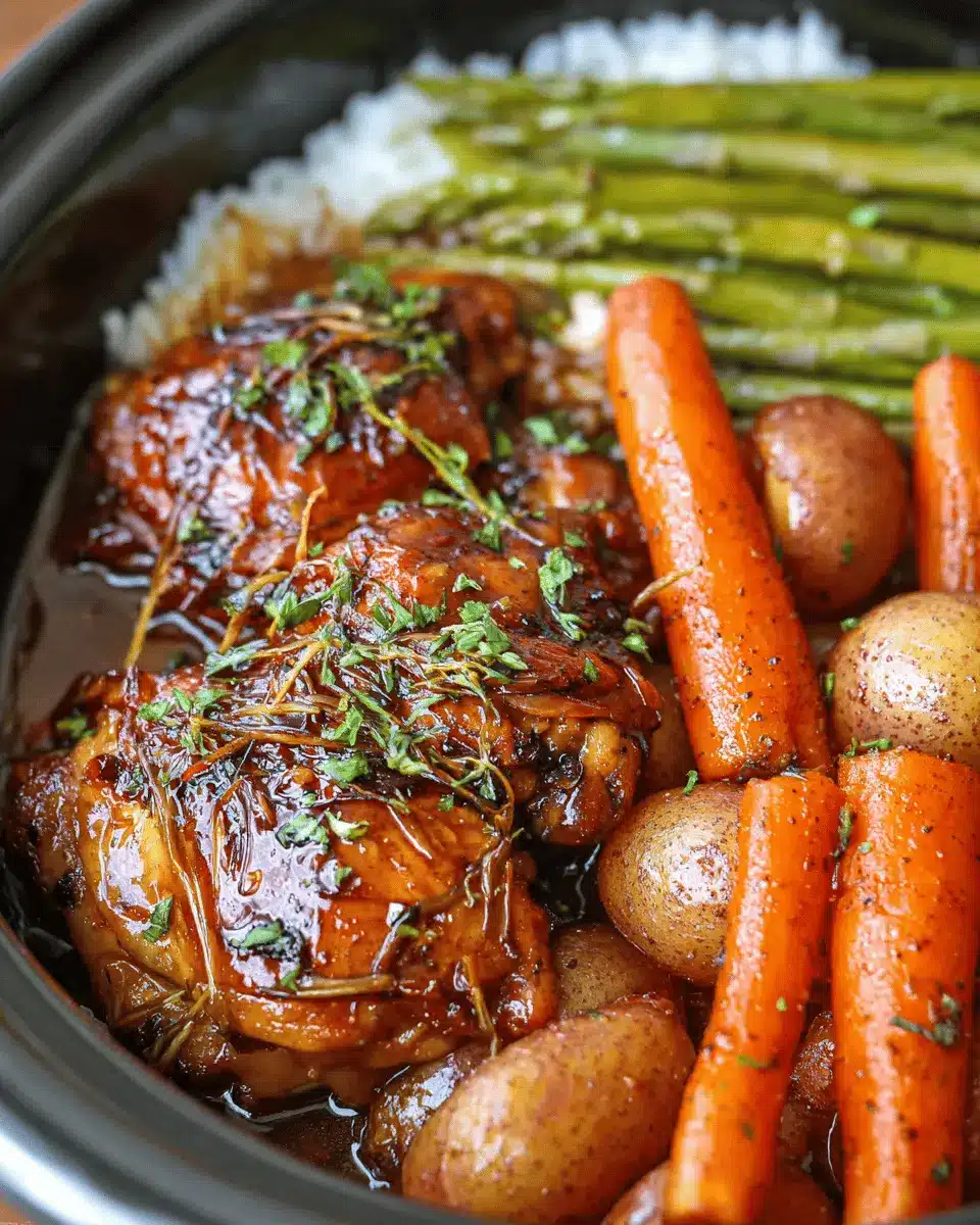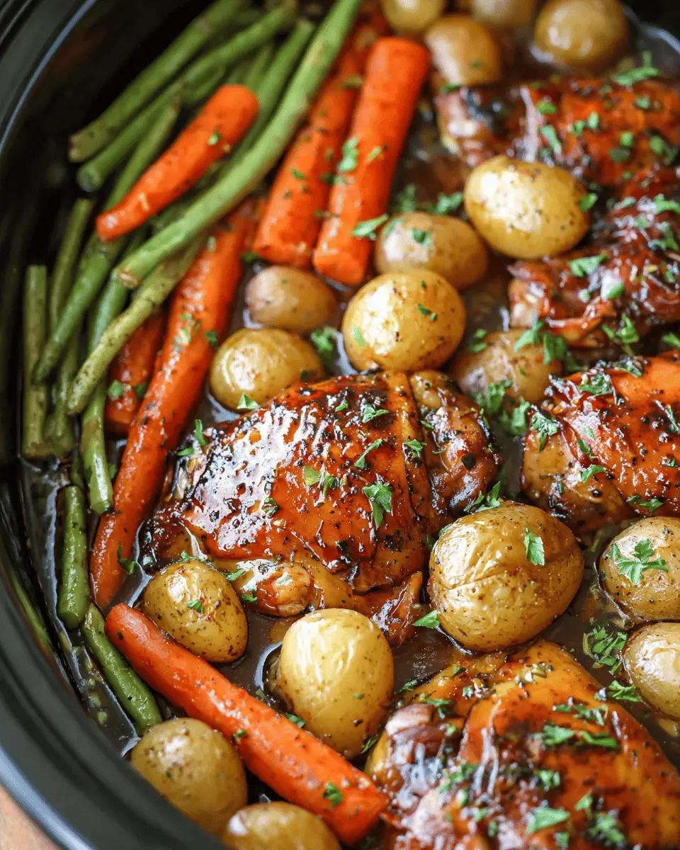 With your sauce ready, it's time to assemble everything in the slow cooker. Place the chicken thighs at the bottom and add the halved potatoes and carrots on top. Pour the honey garlic sauce over everything, ensuring the chicken and veggies are well coated. This step is essential for infusing maximum flavor into the dish.