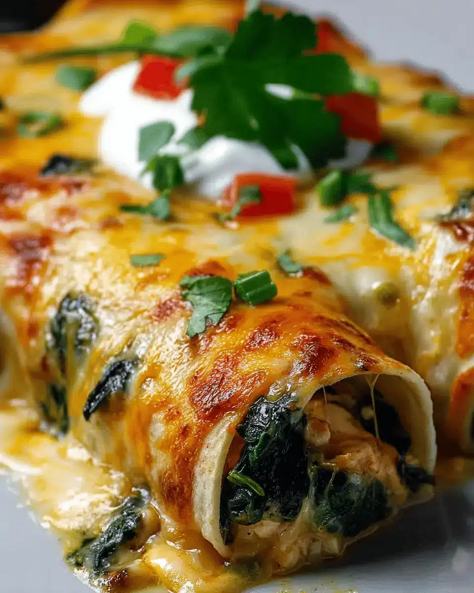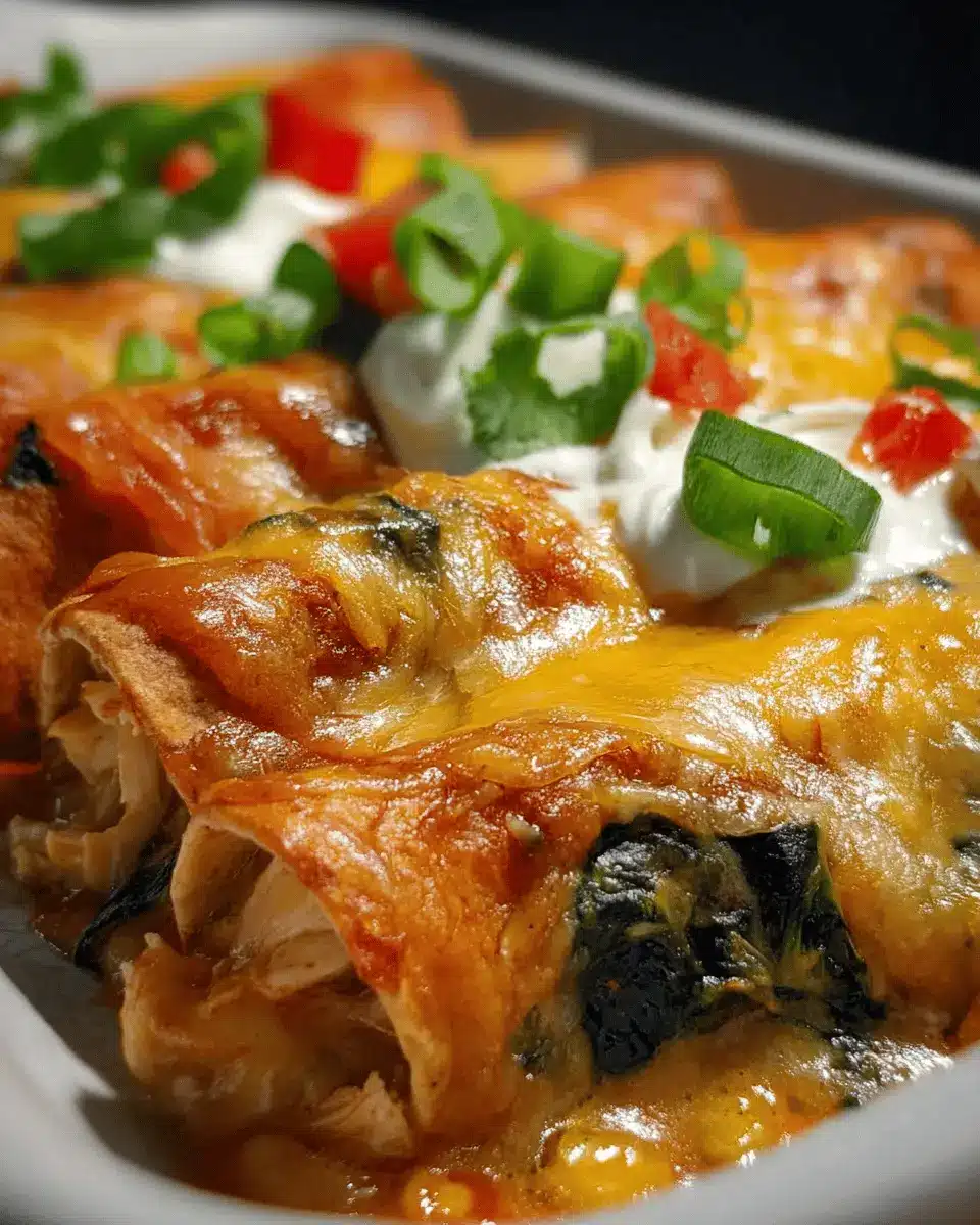 Presentation can elevate your Spinach and Chicken Enchiladas from everyday to extraordinary! Top each serving with a sprinkle of fresh cilantro for a burst of color and flavor. A dollop of sour cream or a drizzle of homemade avocado crema adds richness, while sliced green onions can provide a bright, fresh finish. For a playful touch, opt for a few sliced jalapeños for those who enjoy a little heat. Don’t forget to serve with lime wedges on the side, perfect for a zesty squeeze right before digging in!