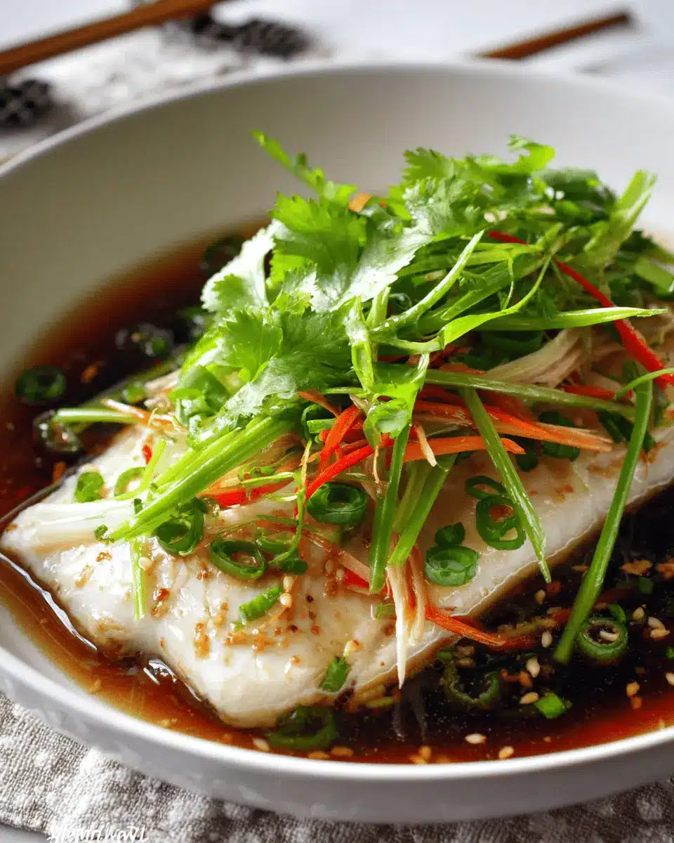 Now, it’s time to steam! Arrange the julienned ginger, onion, and carrot over the prepared fish. Cover the plate with foil to trap steam and place it in your steamer. Allow it to cook for about 8-9 minutes. When the time is up, carefully remove the foil, pour the sauce over the fish, and add the scallions on top. Cover again (no foil needed this time) and let it steam for an additional 4-6 minutes, or until the fish flakes easily with a fork.