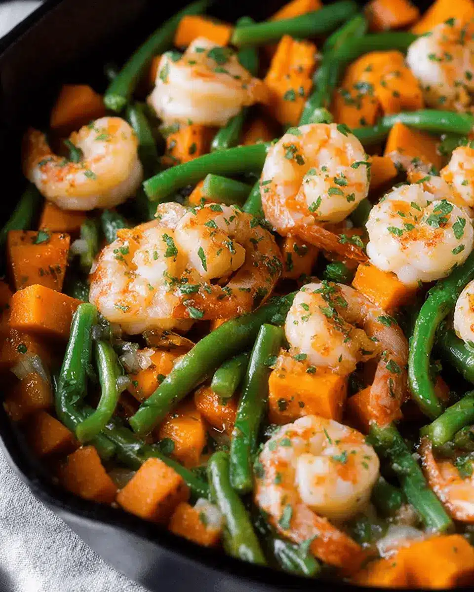 In just 30 minutes, you can whip up this delicious sweet potato green beans shrimp skillet. Perfect for a weeknight meal when time is of the essence!