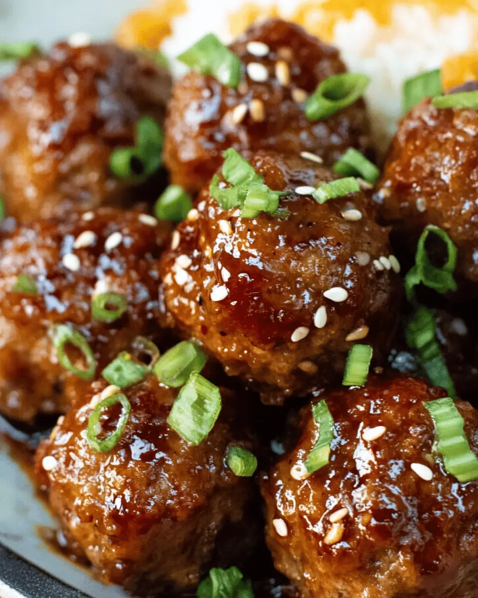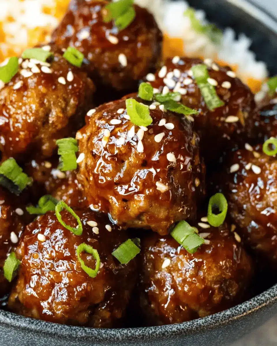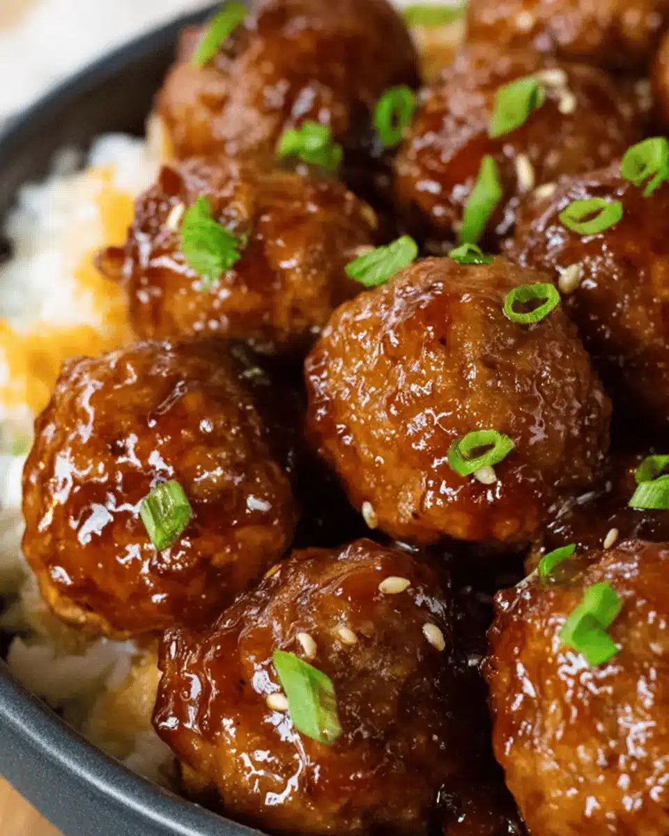 - Layering: Start with a bed of rice, then arrange the meatballs artfully on top. Drizzle with glaze and sprinkle with sesame seeds and sliced green onions.
