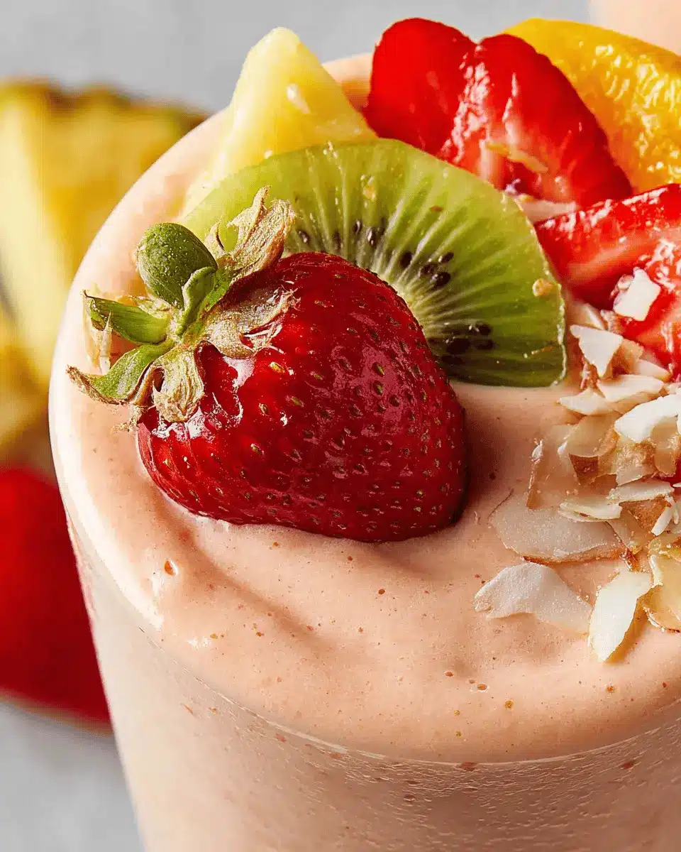 Enhance your tropical smoothie experience by adding vibrant garnishes. Consider topping your smoothie with: