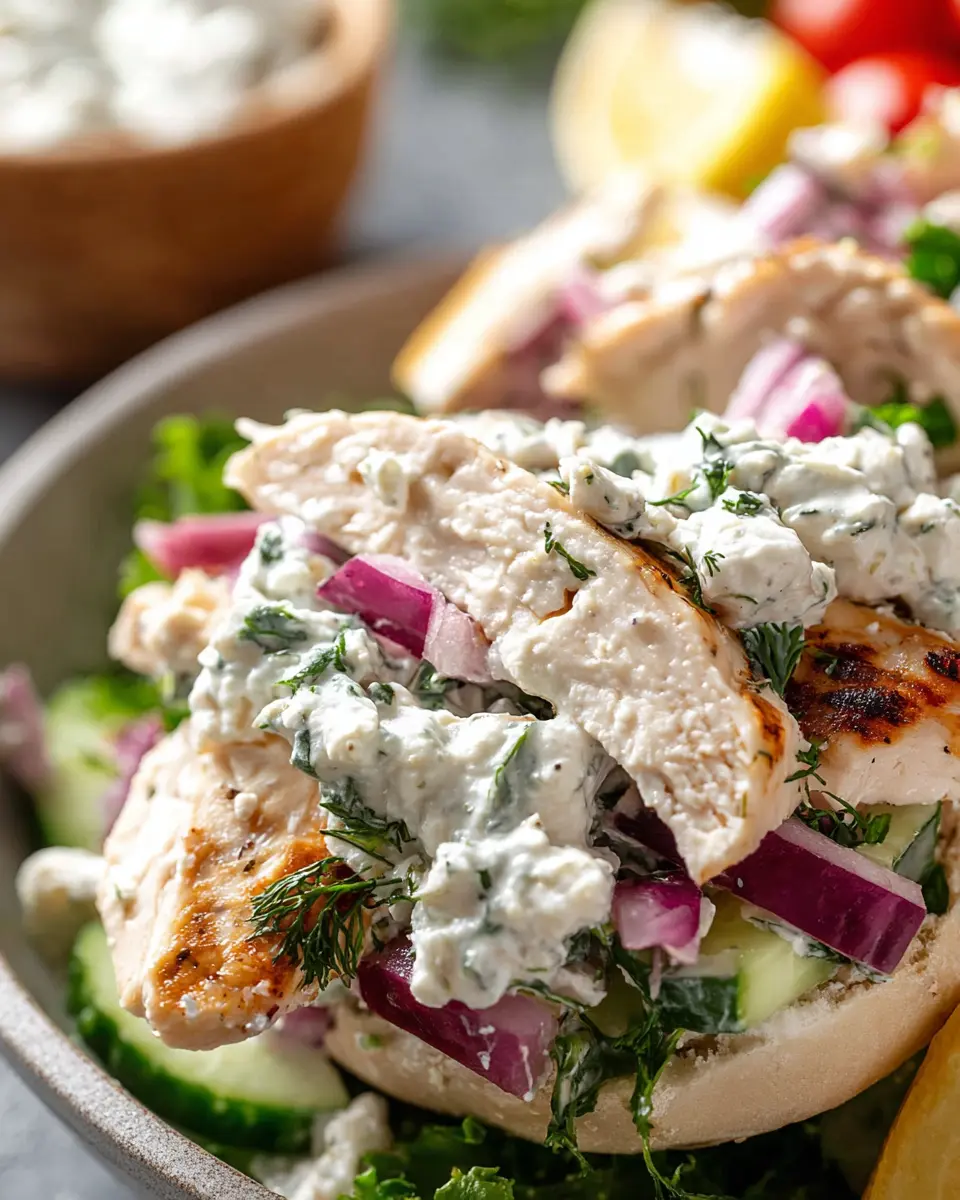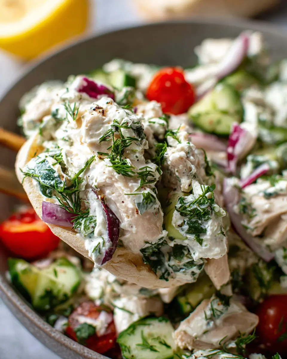 Greens: For a lighter option, serve the salad over a bed of mixed greens or romaine. This will add a refreshing crunch while letting the flavors of the chicken and tzatziki shine.