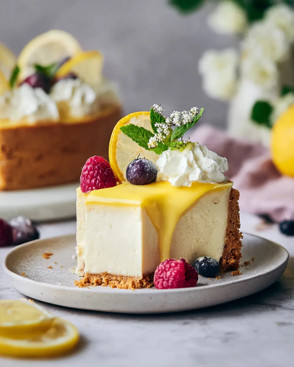 Finally, gently pour the cooled lemon curd over your cheesecake. Let it set in the refrigerator for about an hour before serving. To finish, feel free to garnish with some dairy-free whipped cream, fresh berries, or mint for a pop of color and flavor.