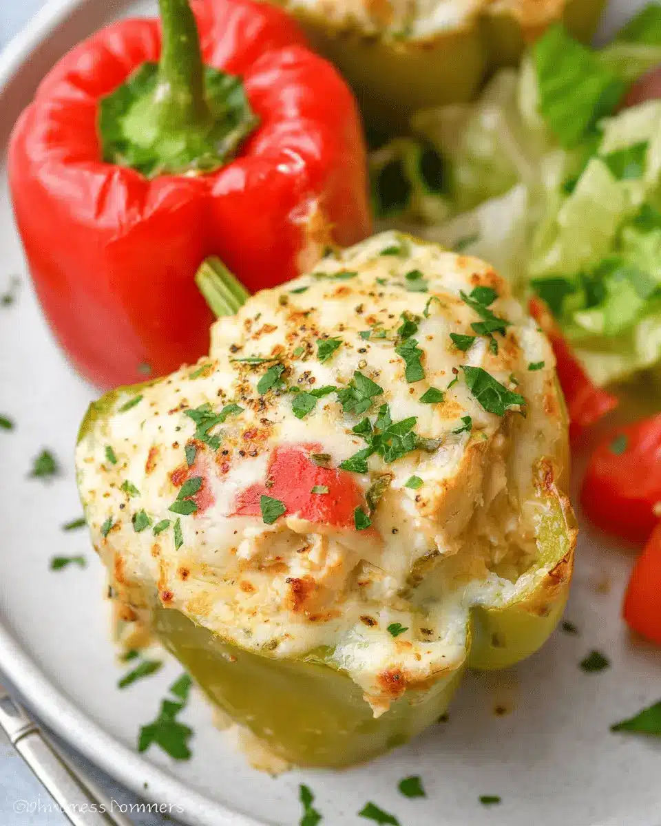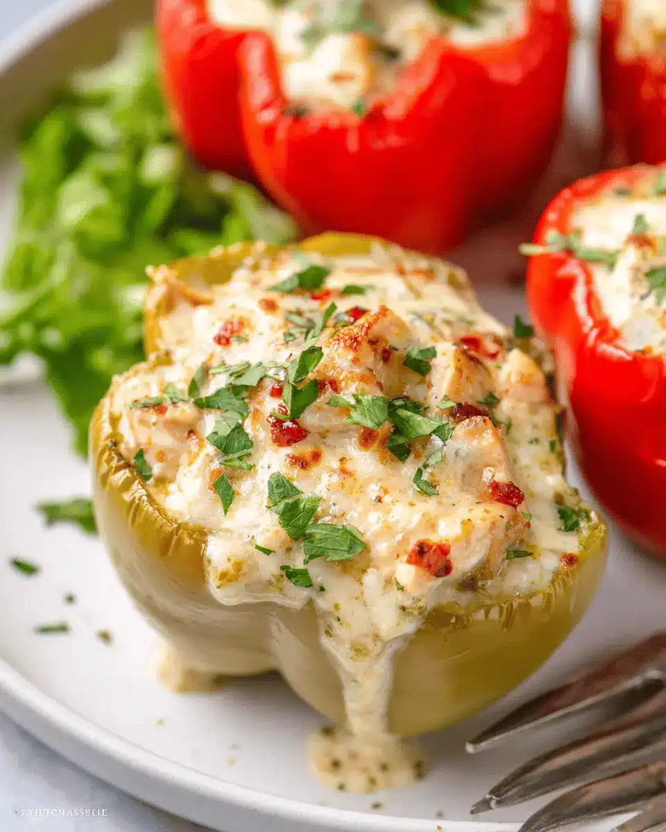 Elevate your peppers with some creative garnishes! A sprinkle of fresh cilantro or green onions adds a pop of color and freshness. Crumbled feta cheese or a swirl of sour cream can enhance the flavor profile, adding creaminess and richness. For a bit of heat, consider garnishing with sliced jalapeños or a drizzle of hot sauce. These small touches can turn your white chicken chili stuffed peppers into a visually stunning and flavor-packed meal!